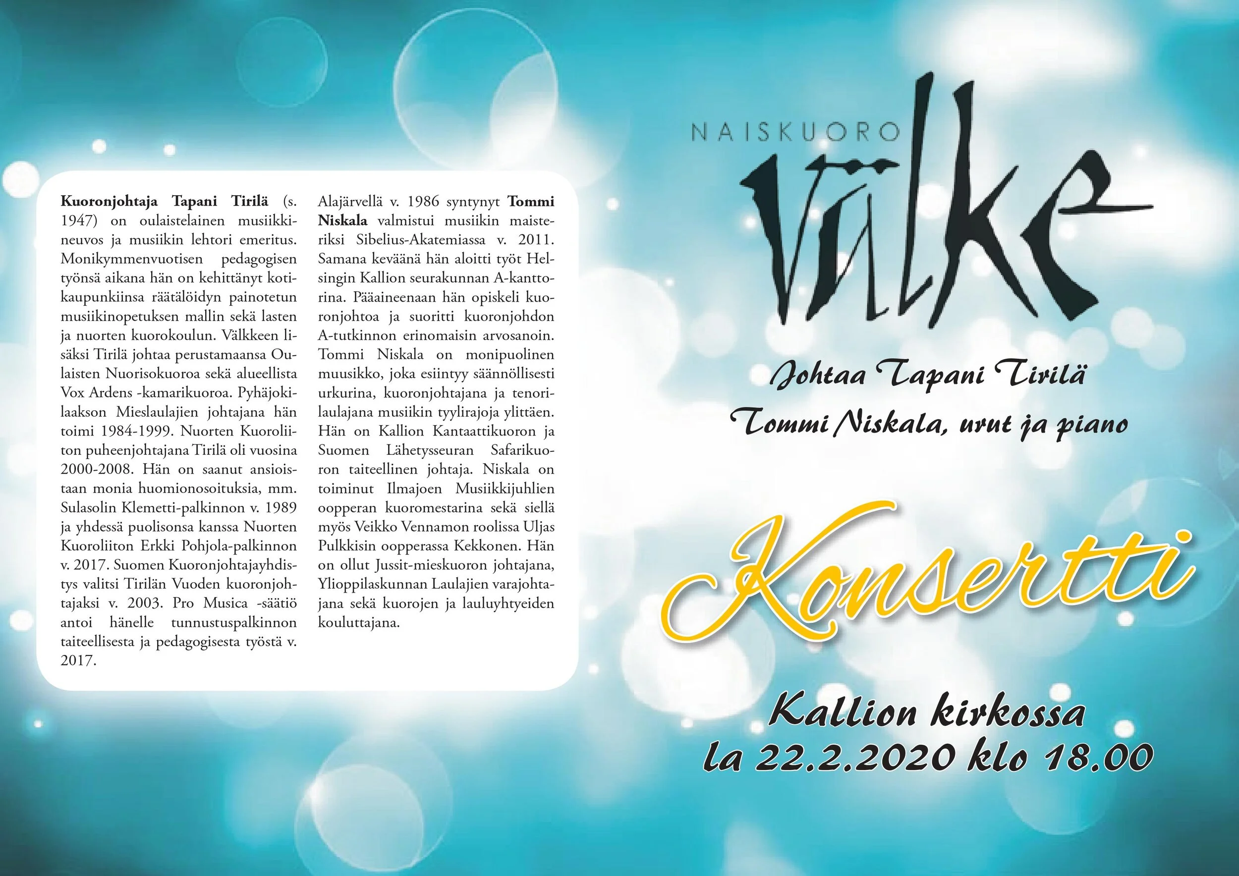 Koska suurin osa välkeläisistä on entisiä Oulaisten nuorisokuorolaisia, on joitakin teoksia poimittu nuorisokuoroaikaisesta materiaalista. Kuorollemme on tärkeää, että ohjelmistossa on riittävästi omaa persoonallista laulettavaa, joka sopii juuri naiskuorolle. Myös viihteelliset sävelmät ovat osa tätä kokonaisuutta. Kuoromme haluaa olla mukana myös erilaisten projektien toteutuksessa yhdessä muiden kuorojen ja artistien kanssa, mistä hyvinä esimerkkeinä ovat muun muassa Orfin Carmina Burana, Pergolesin Stabat Mater ja Faurén Requiem.